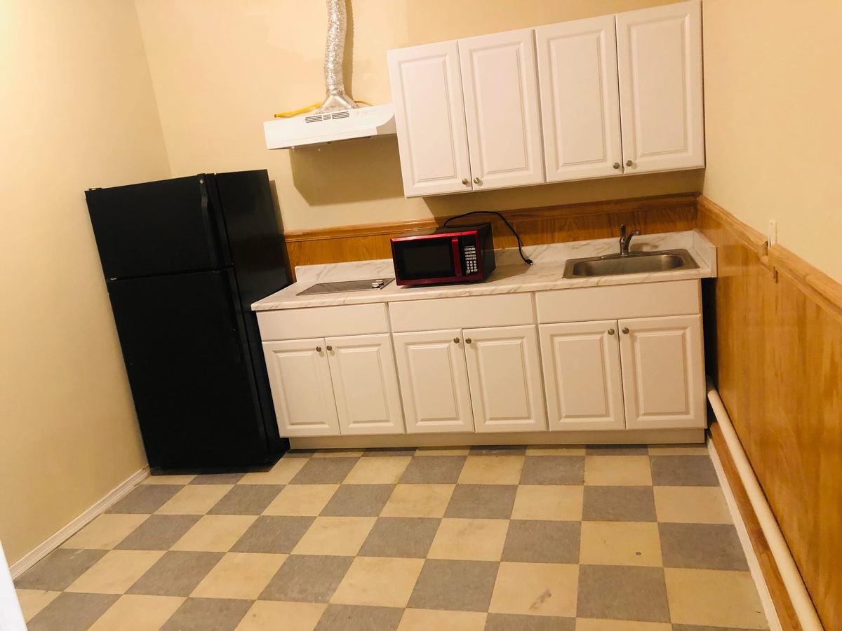 Ground floor bedroom attached to a full bathroom and patio. Seperate kitchen next to the bedroom that includes 1 microwave, 1 fridge, stove built into to the countertop, cabinets .